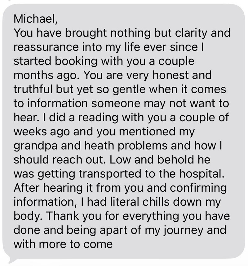 “Truly amazing! Michael put me at ease before I even said a word and provided mind‑blowing, detailed insights that answered all my questions. I’m still in awe.”